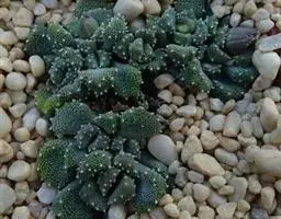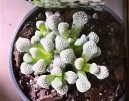 雷童为多年生肉质草本植物,呈分枝密集的灌木状,高 雷童开花 约30厘米,二歧分枝,老枝灰褐色或浅褐色,新枝淡绿色,上有白色小突起。肉质叶卵圆半球形,长1~1.3厘米,厚0.6~0.7厘米,基部合生,暗绿色,表皮具白色半透明的肉质刺,老叶的肉质刺常脱落,留下圆形疵状疤痕。花单生,具短梗,花很小,径仅1.2一1.5厘米,花白色或淡黄色。
