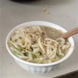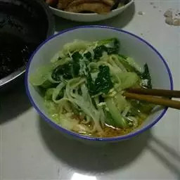 ②在汤面中加入蔬菜叶、适量食醋、芝麻油、香菜,味道鲜美,也可依个人口味任意配料。