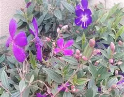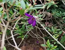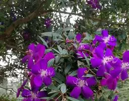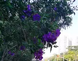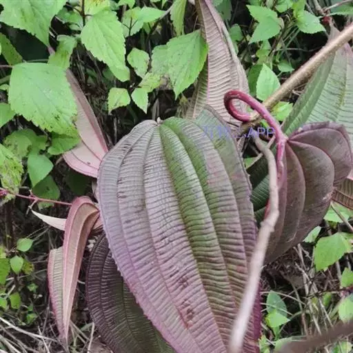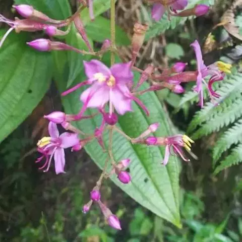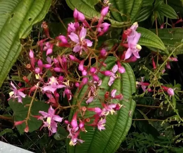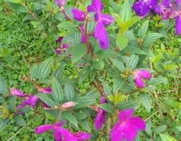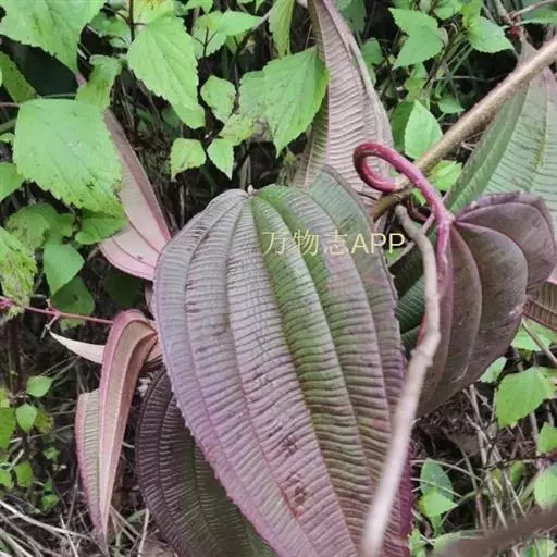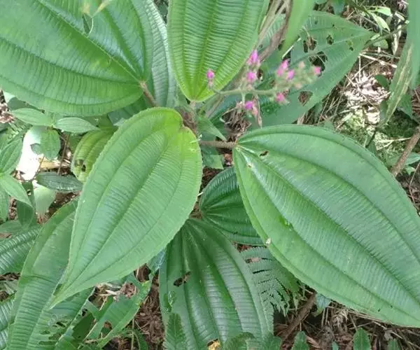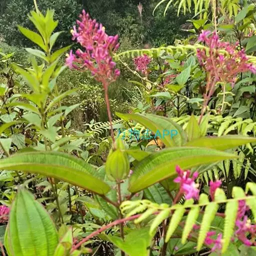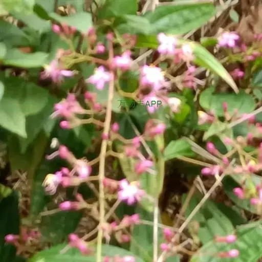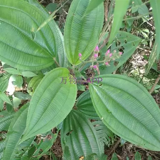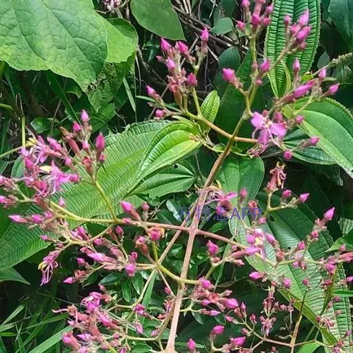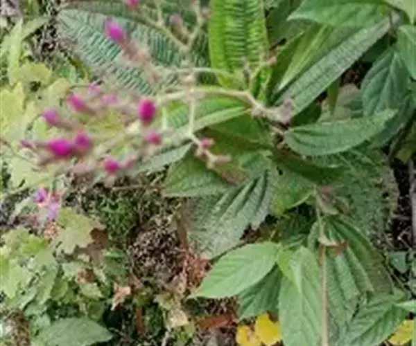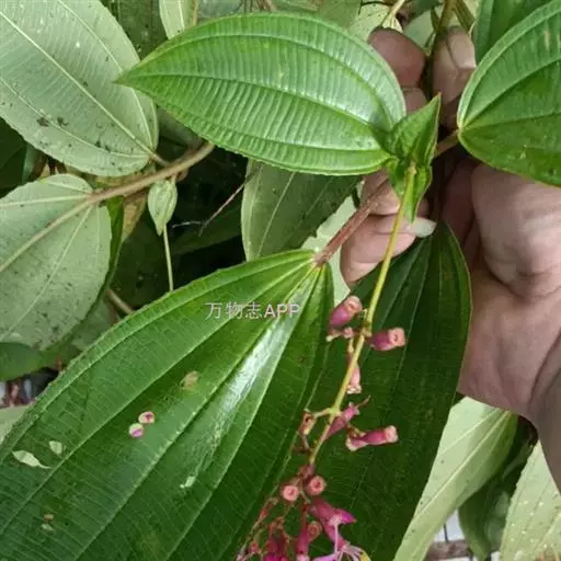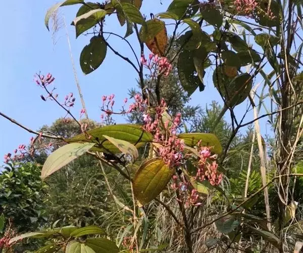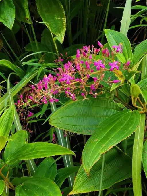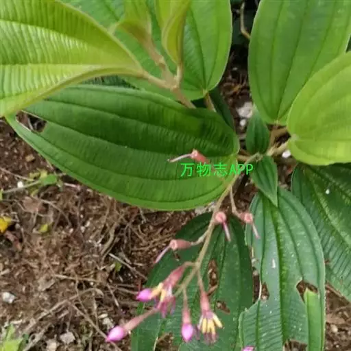 灌木,高1-2米,稀达6米;茎四棱形或钝四棱形,通常具槽,幼时被糠秕状星状毛及具微柔毛的疏刚毛。叶片坚纸质,卵形或狭椭圆状卵形或近椭圆形,顶端渐尖,基部圆形或浅心形,长12-24厘米,宽4.6-11厘米,稀长32厘米,宽15.5厘米,边缘具不整齐小齿,7基出脉,叶面被糠秕状鳞片或几无,基出脉下凹,背面通常仅于脉上被糠秕状星状毛,脉明显,隆起,细脉与侧脉垂直;叶柄长1-7.5厘米,有槽,通常密被糠秕状星状毛,槽内被具微柔毛的刚毛。由聚伞花序组成的圆锥花序,顶生,被糠批状星状毛,长20-30厘米,稀较短,基部具叶状总苞2;苞片和小苞片小,披针形或钻形,长1-3毫米;花萼长约8毫米,幼时密被星状毛,以后渐脱落,狭漏斗形,具钝四棱,有纵脉8条,裂片扁三角状卵形,长约1毫米,顶端急尖,具突起的小尖头;花瓣红色至粉红色,或深玫瑰红色,卵形,长约7毫米,于右上角突出1小片,顶端具突起的小尖头并被微柔毛;雄蕊长者紫色,药隔隆起而不伸长,短者黄色,药隔隆起,基部伸长成短距;子房下位,无毛。蒴果倒卵形,顶端具胎座轴,长约8毫米,直径约6毫米;宿存萼较果长,漏斗形。花期7-9月,稀10月,果期1-3月,稀达5月。