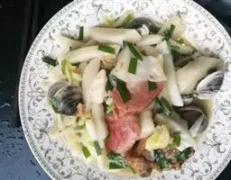 7、大白菜(小白菜)、肉丝、香菇丝。 大火,先炒肉丝,熟:改微火,加白菜,加香菇,炒几下,将切好的年糕片铺在上面,加盐、胡椒、少许味精,盖锅盖,等上气后约1-2分钟,开盖,如年糕已软,改小火,拿锅铲炒,年糕和作料尽量拌匀,不动,让年糕下面起一层薄薄的锅巴,即可。