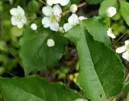 花多数,成顶生复伞房花序,直径5-10厘米;总花梗和花梗均无毛;花直径7-8毫米;萼筒杯状,无毛;萼片三角形,长1毫米,先端急尖,外面无毛,内面有柔毛;花瓣白色,反卷,倒卵形,长约3毫米,先端圆钝,内面近基部有白色绒毛,基部有短爪;雄蕊20,约与花瓣等长或较短;花柱2,稀为3,离生或下部合生,柱头头状,子房顶端有柔毛。果实卵形,长约5毫米,红色,无毛。
