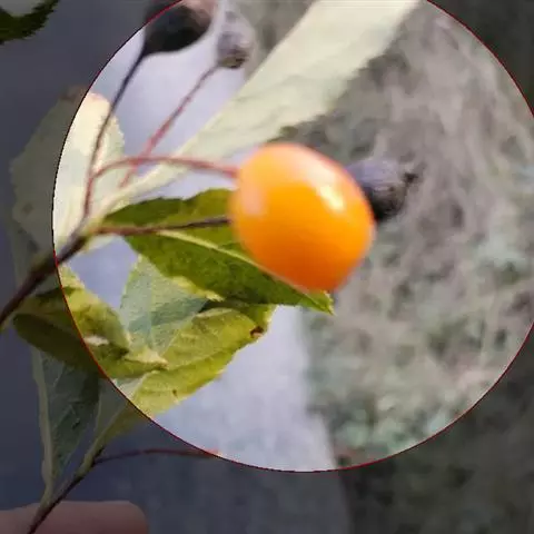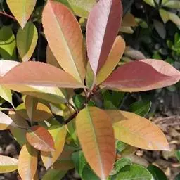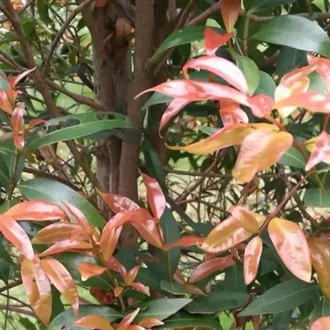 常绿乔木,高3-5米,可达7米;老枝灰黑色,无毛,皮孔棕黑色,近圆形,散生。叶片革质,幼时及老时皆呈红色,椭圆形、长圆形或长圆倒卵形,长5-9厘米,宽2-4厘米,先端渐尖,基部楔形,边缘有疏生浅钝细锯齿,两面无毛,侧脉10-18对;叶柄长1-1.5厘米,无毛。