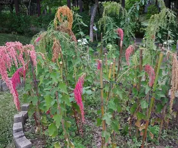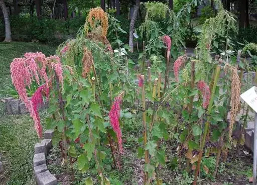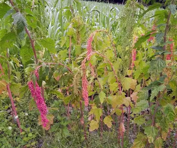 一年生草本,株高约 1~2 公尺,茎紫红色或有红色纵纹。叶互生,三角状狭卵形,长 1~5 公分,先端钝叶缘呈不规则状,波形至锯齿缘,基部楔形,叶下表面带粉;叶柄长 0.5~3 公分。穗状花序,顶生,花被片 5,春至夏开花结果。种子横生,果实穗状下垂,长可达1公尺,有红、橙红、紫红等颜色。花果期5-10月。原产地台湾、分布遍及全球温带及热带,我国各地均产。