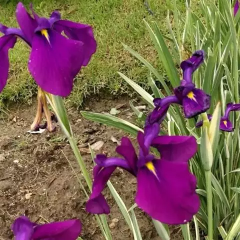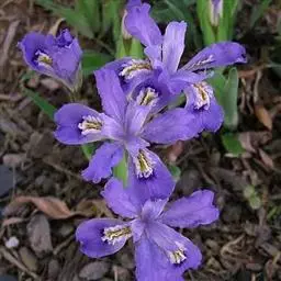 扇形鸢尾,多年生草本,高达100cm。根茎横生,粗壮,直径达1cm,黄白色,节明显;须根分枝较多,黄白色。地上茎扁圆柱形,节明显。叶黄绿色,集生茎顶,基部套叠,排成扇面状,叶片宽剑形,长50-70cm,宽5-7cm,先端渐尖,基部鞘状,花茎高30-50cm,有纵棱和浅沟;总状圆锥花序,有5-7分枝,每分枝处有3-5苞片,内含2-4朵花;花蓝紫色,直径7.5-8cm,花被管长约2cm,外花被裂片倒卵形,有深紫色的斑纹及条纹,边缘波状皱褶,中肋上具黄色鸡冠状附属物,内花被裂片倒披针形或狭倒卵形;雄蕊3,花药黄色;花柱分枝3,淡蓝色,花瓣状;子房下位,纺锤形,长7-8mm。蒴果椭圆状,长2.8-3.5cm,直径1.3-1.5cm,先端具短尖,有6条棱;种子扁平,半圆形,棕褐色,直径约4mm。花期4月,果期5-8月。