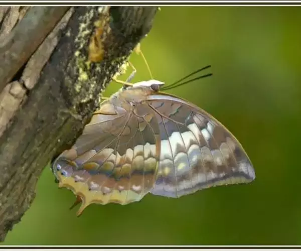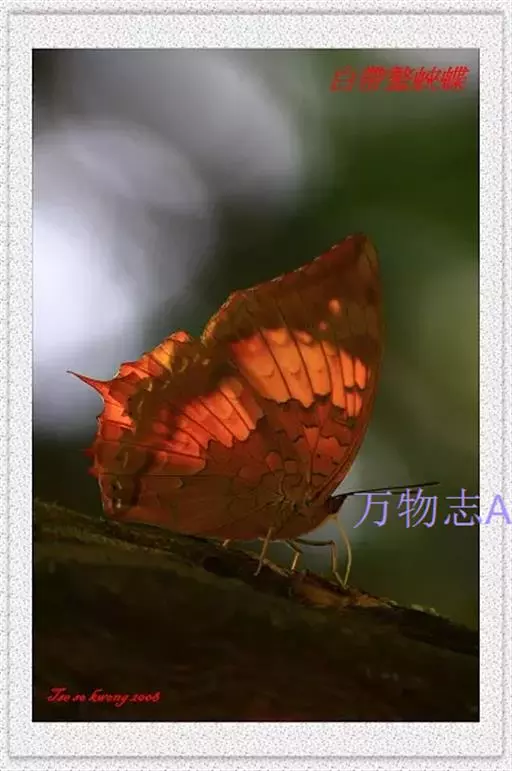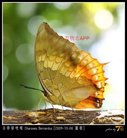 白带螯蛱蝶Charaxes bernardus (Fabricius)是鳞翅目蛱蝶科螯蛱蝶属的一种蝴蝶。我国共有3个亚种,分别为:白带鳌蛱蝶指名亚种C. b. bernardus(Fabricius)分布(赣、闽、港、粤、桂);白带鳌蛱蝶华西亚种C. b.hierax Felder et Felder分布(川、滇);白带鳌蛱蝶海南亚种C. b. hainanus Gu分布(琼)。 成虫外观美丽,前翅中央有一白色宽带,极具观赏性。