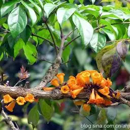 炮仗藤 Miers)紫葳科炮仗藤属藤本植物。小枝顶端有丝状卷须;叶对生,卵形;花萼钟状,橙红色,…