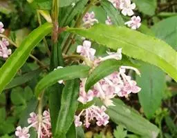 伞形花序,生于枝条顶端,无柄,有花10余朵;花梗长约1厘米,多少具腺点;花长约9毫米,花萼仅基部连合,长约5毫米,无毛,萼片斜菱形,不对称,顶端广圆形,薄,基部厚,全缘,紧包花冠;花冠白色,钟形,长约9毫米,管长3-4毫米,里面被长柔毛,裂片卵形,顶端渐尖,基部略不对称,长约5毫米,花时反折,花后全部脱落,子房为花萼紧包,露圆锥形花柱;雄蕊较花冠略短;花丝基部连合成管,与花冠管等长或略短,连合部位向花冠的一面被长柔毛,里面无毛,分离部分无毛;花药卵形或长卵形,与花丝几成丁字形;雌蕊与花冠等长,子房卵形,与花柱无明显的界线,连成一圆锥体。蒴果圆柱形,弯曲如新月形,顶端渐尖,长约6至8厘米,直径约5毫米;宿存萼紧包基部。花期12月至翌年1-2月,果期10-12月,有时花期4月,果期2月。