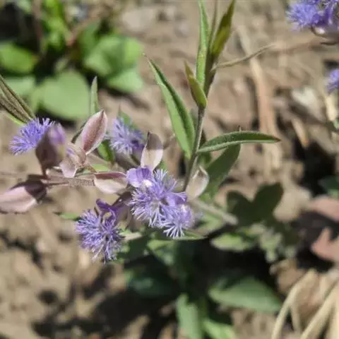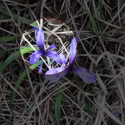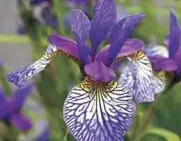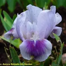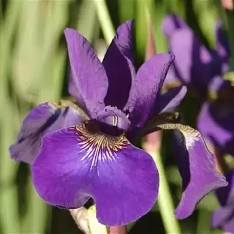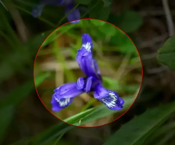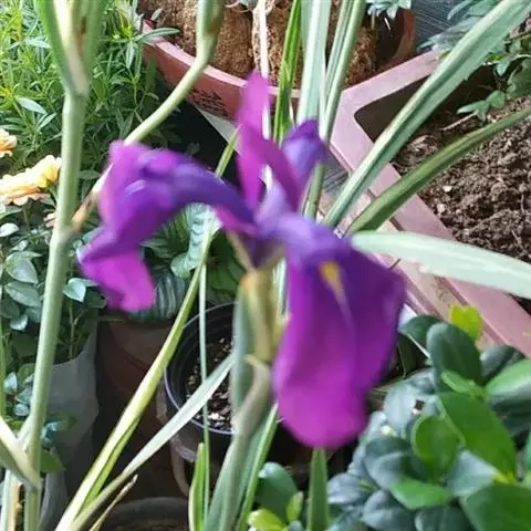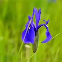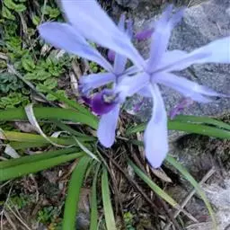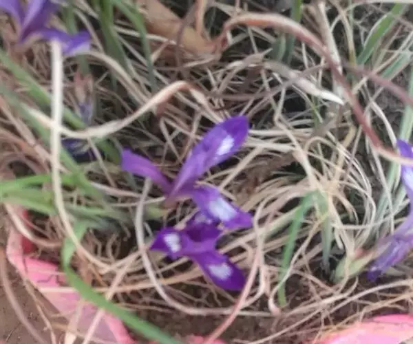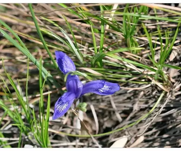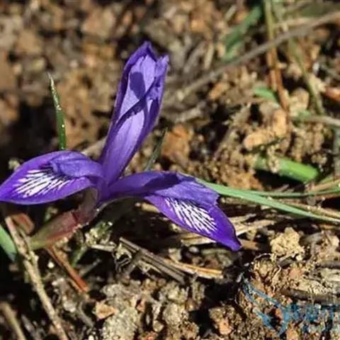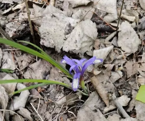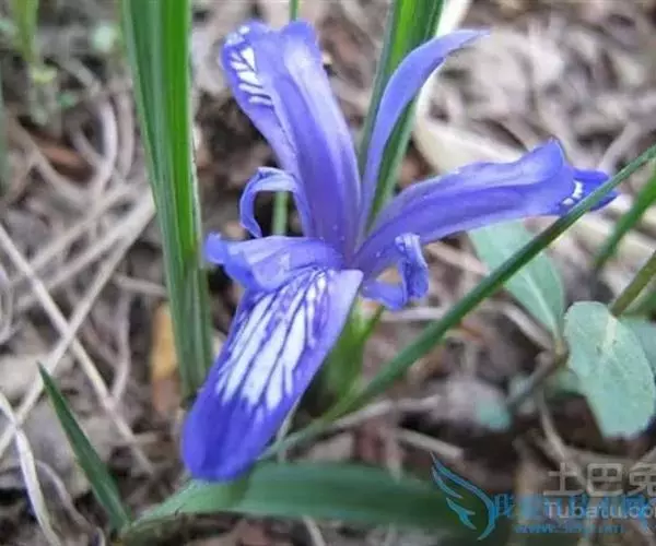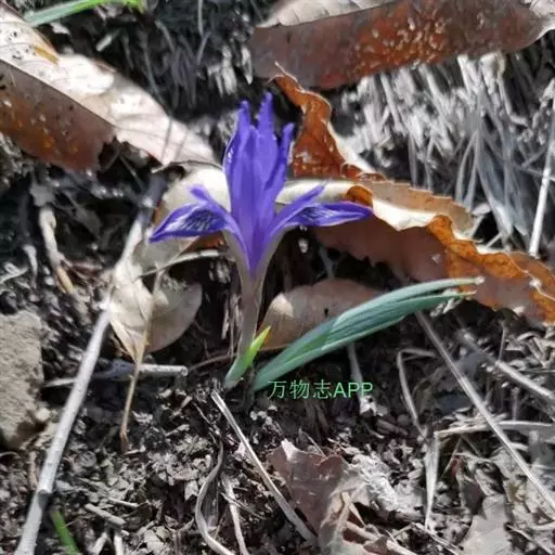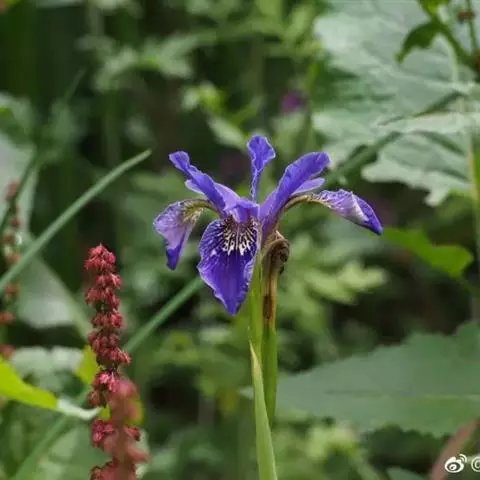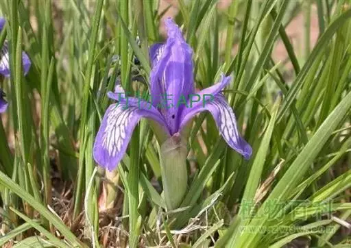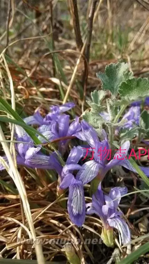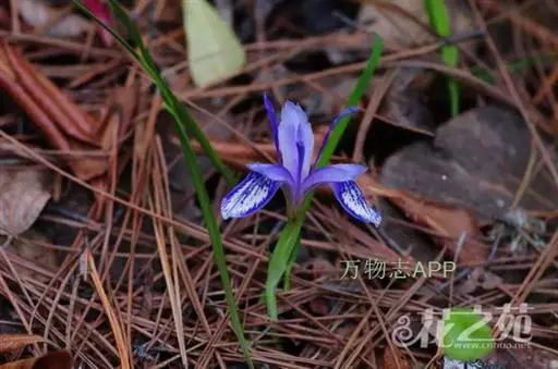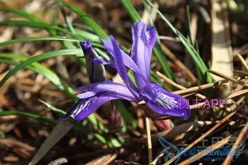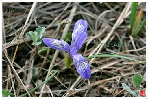 紫苞鸢尾(学名:Iris ruthenica Ker Gawl.):多年生草本,植株基部围有短的鞘状叶。根状茎斜伸,二歧分枝,节明显;须根粗,暗褐色。叶条形,灰绿色,有3-5条纵脉。花茎纤细,略短于叶,高15-20厘米,有2-3枚茎生叶;苞片2枚,膜质,内包含有1 朵花;花蓝紫色,直径5-5.5厘米;外花被裂片倒披针形,有白色及深紫色的斑纹,内花被裂片直立,狭倒披针形。蒴果球形或卵圆形,直径1.2-1.5厘米,6条肋明显,顶端无喙;种子球形或梨形,有乳白色的附属物,遇潮湿易变粘。花期5-6月,果期7-8月。