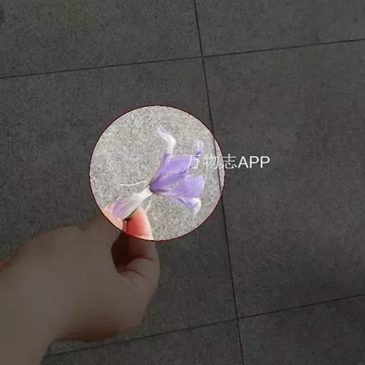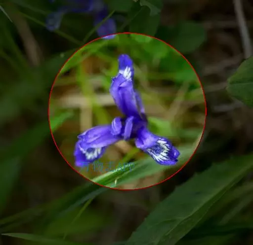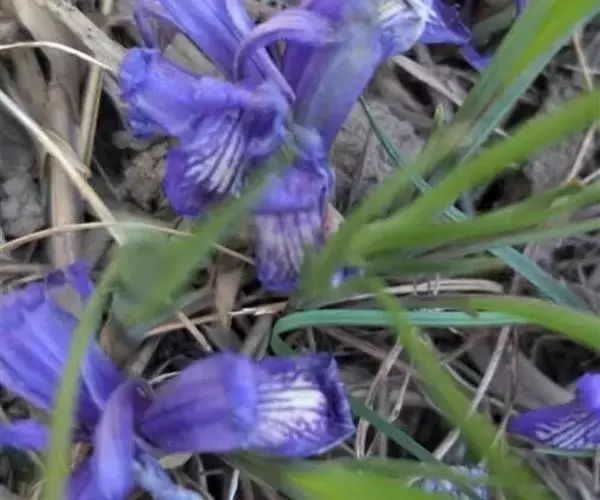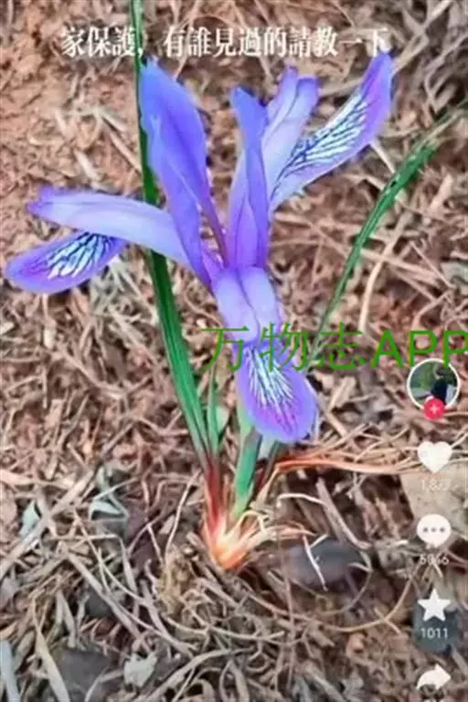 花茎纤细,略短于叶,高15-20厘米,有2-3枚茎生叶;苞片2枚,膜质,绿色,边缘带红紫色,披针形或宽披针形,长约3厘米,宽0.8-1厘米,中脉明显,内包含有1 朵花;花蓝紫色,直径5-5.5厘米;花梗长0.6-1厘米;花被管长1-1.2厘米,外花被裂片倒披针形,长约4厘米,宽0.8-1厘米,有白色及深紫色的斑纹,内花被裂片直立,狭倒披针形,长3.2-3.5厘米,宽约6毫米;雄蕊长约2.5厘米,花药乳白色;花柱分枝扁平,长3.5-4厘米,顶端裂片狭三角形,子房狭纺锤形,长约1厘米。
