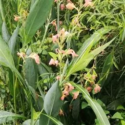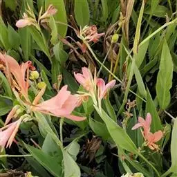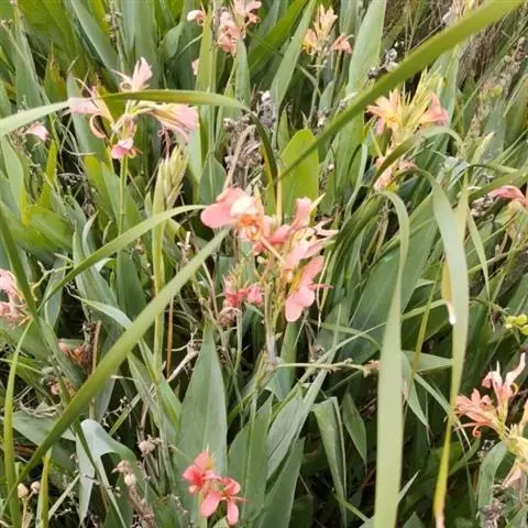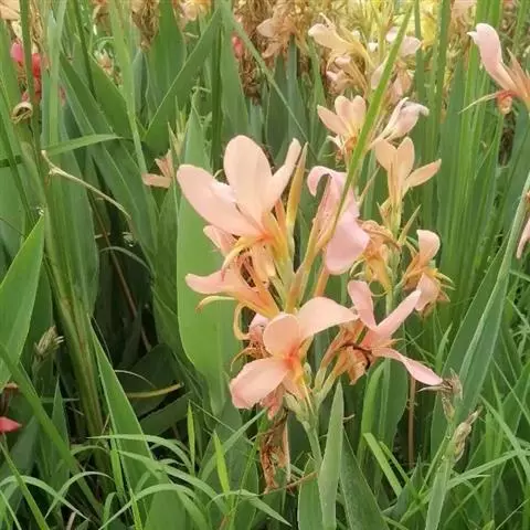 粉美人蕉(学名:Canna glauca L.):是一种球根草本植物。根茎延长,株高1.5-2米;茎绿色。叶片披针形;总状花序疏花,单生或分叉,稍高出叶上;苞片圆形,褐色,花黄色,无斑点;有多种园艺栽培品种,颜色从粉、橙红色及具带红色斑点等。花期:夏、秋。