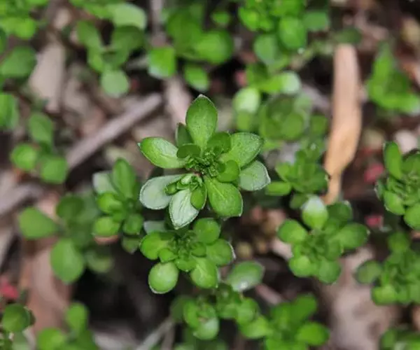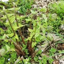 一年生草本。茎高15-50厘米。叶互生,上部为3叶轮生,下部叶常脱落,叶菱状椭圆形,长3-6厘米,宽1-2厘米,两端渐狭,钝,常聚生在花序下,有叶柄,长达1厘米。苞片圆形或稍长,与花略同长。