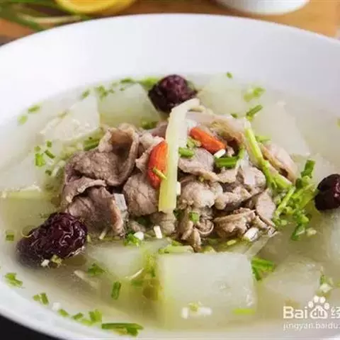 原料:冬瓜100克,瘦羊肉80克,枸杞3克,生姜10克,葱10克。