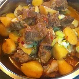 3、锅内倒入清水二斤,放入羊肉在旺火上烧开后,撇去浮沫,把肉捞出洗净。接着,再换清水三斤烧开,放入羊肉、大料、花椒、小茴香、桂皮、葱段、姜片、绍酒和精盐。待汤再烧开后,盖上锅盖,移在微火上煮到肉烂为止。将肉捞出,盛在盘内,蘸着调料汁吃。