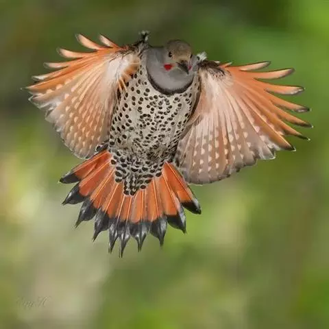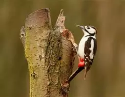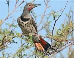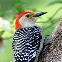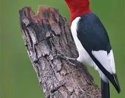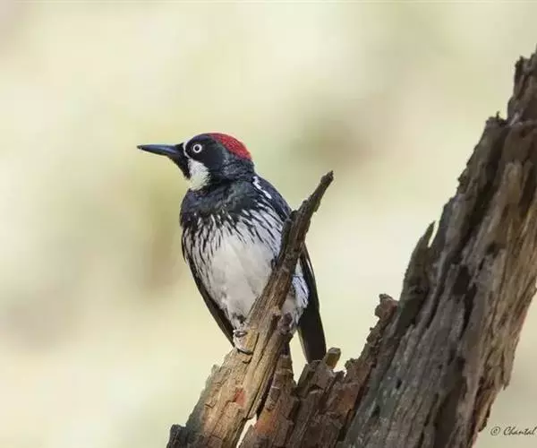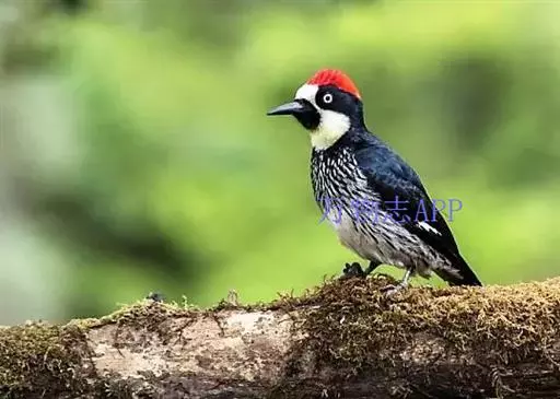 橡树啄木鸟(学名:Melanerpes formicivorus):体长20-23厘米。前额灰黄色,头顶、后颈红色。喉下部、腰和腹部白色,腹部有细的黑色纵条纹。其余体羽为黑色。嘴黑色。腿、脚暗灰色。