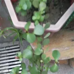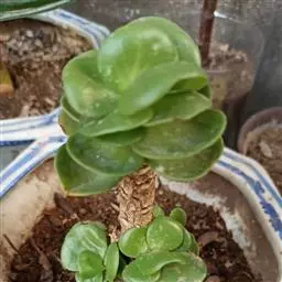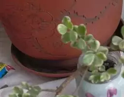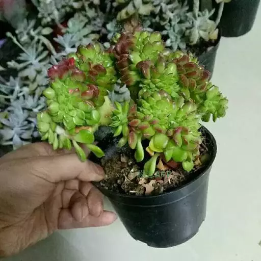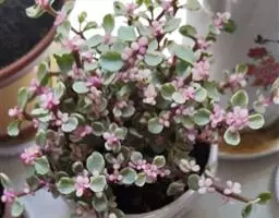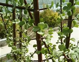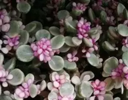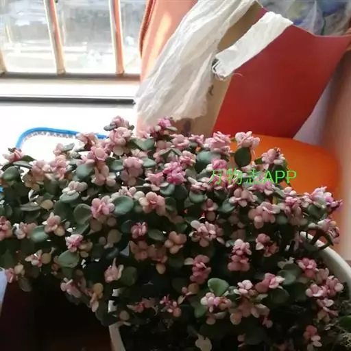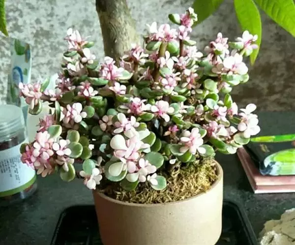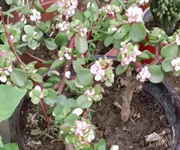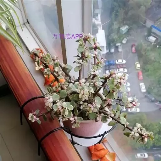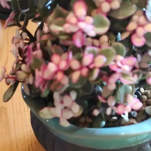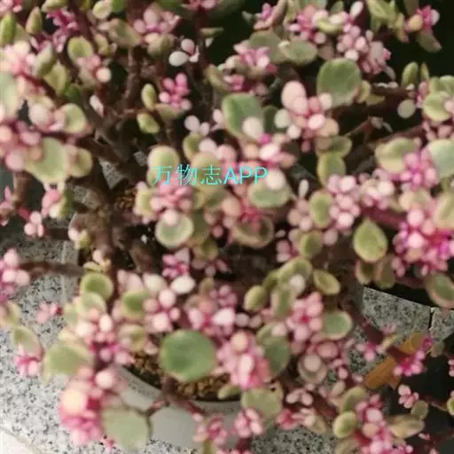 株高3~4米,老茎紫褐色,嫩枝紫红色,分枝近水平,肉质叶对生, 多肉植物雅乐之舞 绿色,倒卵形。雅乐之舞植株较矮,枝条也较为细弱,肉质茎红褐色(新茎)或灰白色(老茎):肉质叶交互对生,叶片大部分为黄白色,只有中央的一小部分为淡绿色;小花的边为淡粉色。
