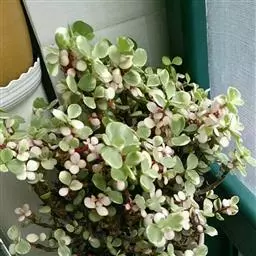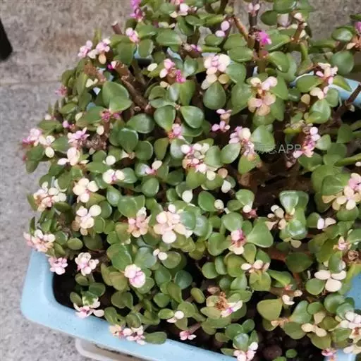 雅乐之舞(Pailulacaria afra var.foliis-variegatis),又名花叶银公孙树,为马齿苋科马齿苋属马齿苋树的锦斑变异品种。原产南非,喜阳光充足和温暖、干燥,通风较好的环境。其叶形叶色较美,有一定的观赏价值。叶片大部分为黄白色,只有中央的一小部分为淡绿色;小花淡粉色,观赏价值较高。