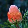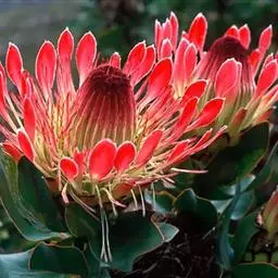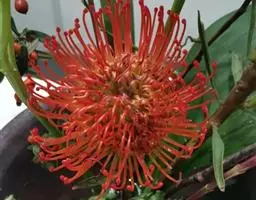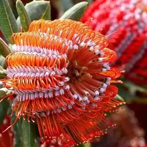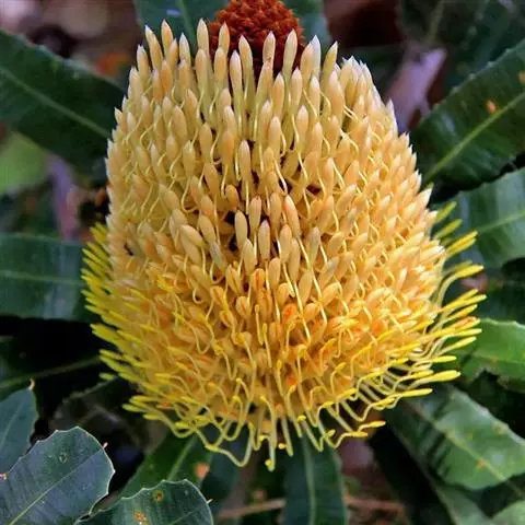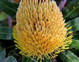 帝王花,山龙眼科帝王花属多年生常绿灌木植;茎干粗壮,叶色翠绿光亮;花朵呈圆球状;其苞片有的完全打开,…