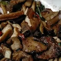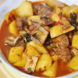 2、锅内烧油至5层热, 倒入豆瓣酱, 快炒干时一起放入姜片, 蒜粒, 八角, 山奈, 干辣椒和花椒, 炒出香味后倒入鸡块, 表面炒熟后烹入少许酱油上色;