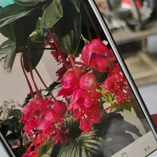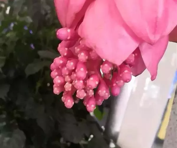 穗状花序下垂,似风铃,花蕾抽出后先露粉红色苞片,花序上绽出珍珠状粉色小圆花,长45厘米,花冠直径约0.25厘米,红色;子房下位,4-5室,萼片宿存,雄蕊等长,8-10个,花药顶具嚎,单孔开裂;花瓣4片,倒卵形至圆形;花外苞片长达3-10厘米,粉红色,别致可爱。