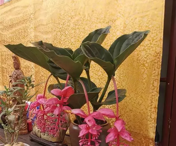 粉苞酸脚杆花株形优美,灰绿色叶片宽大粗犷,粉红色花序下垂,是野牡丹科花卉中属最豪华美丽的一种。盆栽粉苞酸脚杆花最适合宾馆、厅堂、商场橱窗、别墅客室中摆设。