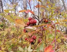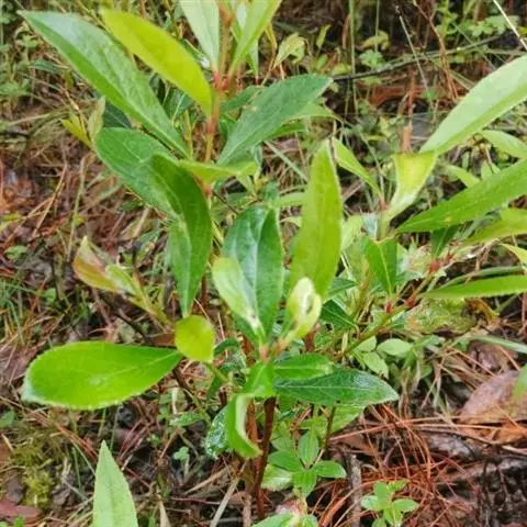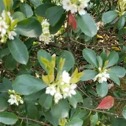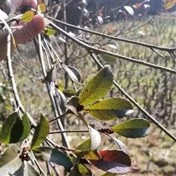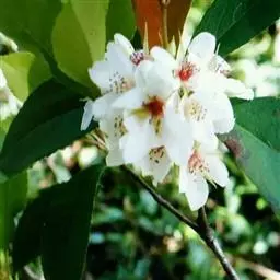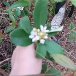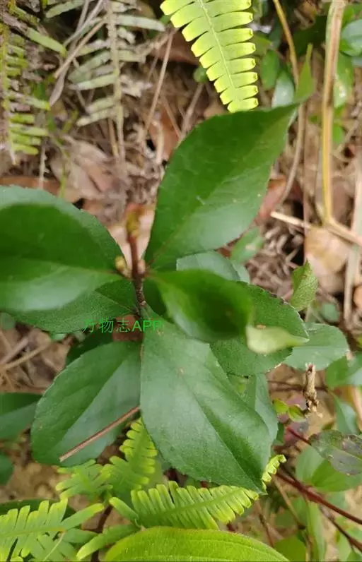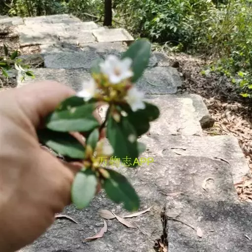 【植物形态】:植物形态:常绿灌木,高可达3米。树皮暗紫褐色或暗灰色,小枝紫棕色,光滑无毛。叶互生,革质,长椭圆或倒卵至倒卵状披针形,长约3.5~8厘米,宽1.5~3.5厘米,先端钝或短渐尖,基部楔形并下延于叶柄,表面暗绿色,背面淡绿色或苍白色,两面无毛,主脉于下面隆起,边缘向下卷,具疏锯齿。花白色带红晕,顶生总状花序或短圆锥花序,花萼5裂,花冠5瓣,雄蕊15枚左右,子房下位,2室。果为梨果状,球形,熟时蓝黑色。