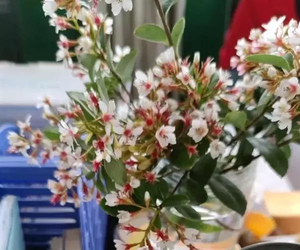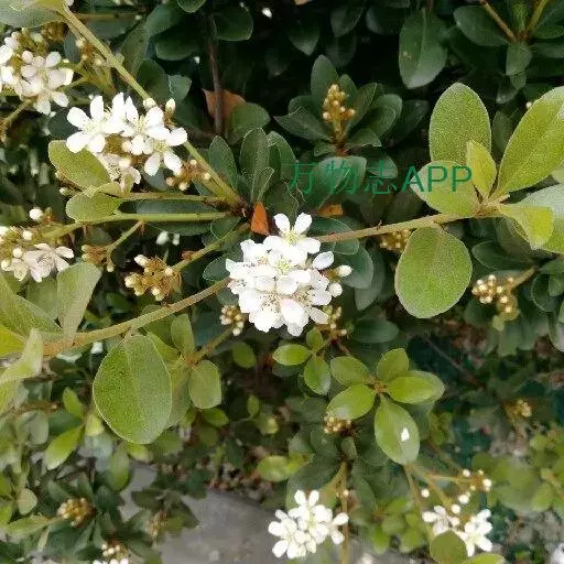 Raphiolepisindica,蔷薇科石斑木属常绿灌木或小乔木。染色体数2n=2x=34。高4m,树冠近球形。单叶互生,卵形或长圆形,长2~8cm,多集生枝端,先端渐尖、急尖或圆钝形;顶生圆锥花序,花瓣白色或淡红色,花径1.0~1.3cm,花期4月;梨果球形,...