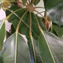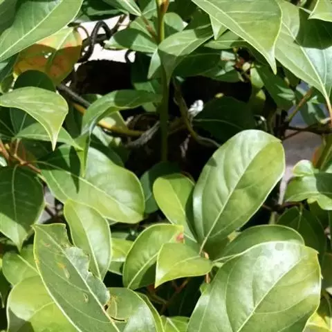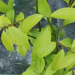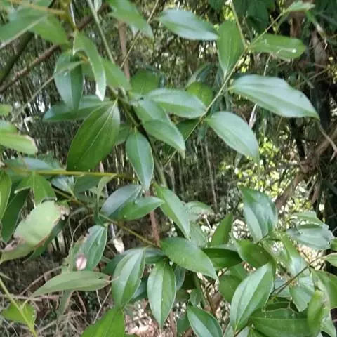 枝条圆柱形,淡褐色,无毛。叶互生,卵状椭圆形,长6-12厘米,宽2.5-5.5厘米,先端急尖,基部宽楔形至近圆形,边缘全缘,软骨质,有时呈微波状,上面绿色或黄绿色,有光泽,下面黄绿色或灰绿色,晦暗,两面无毛或下面幼时略被微柔毛,具离基三出脉,有时过渡到基部具不显的5脉,中脉两面明显,上部每边有侧脉1-3-5(7)条。基生侧脉向叶缘一侧有少数支脉,侧脉及支脉脉腋上面明显隆起下面有明显腺窝,窝内常被柔毛;叶柄纤细,长2-3厘米,腹凹背凸,无毛。