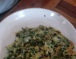 4.锅洗净放入食用油,把上述处理好的鸡蛋豌豆苗倒入锅中小火煎至2面金黄,即可出锅