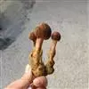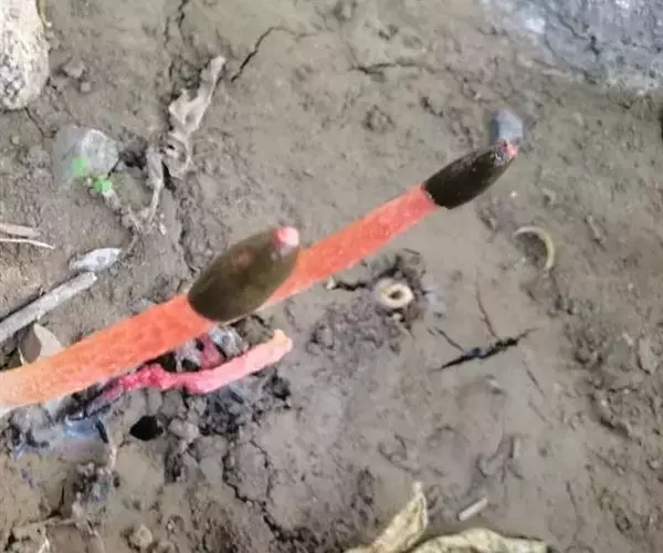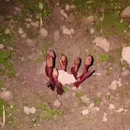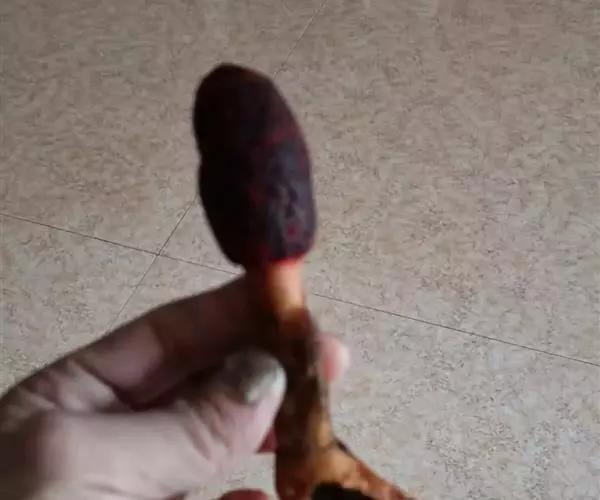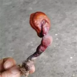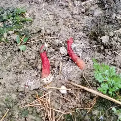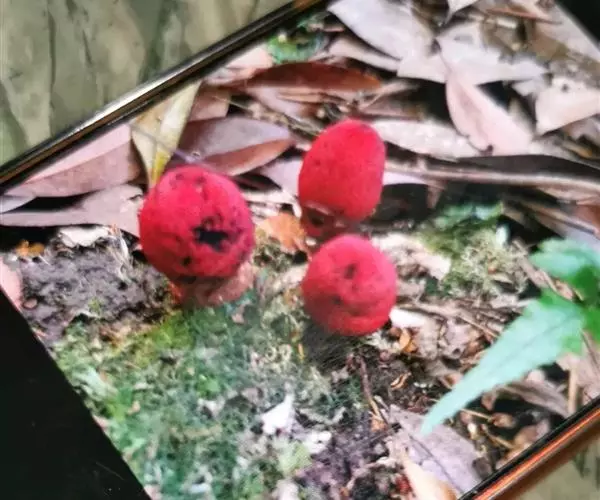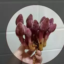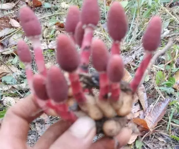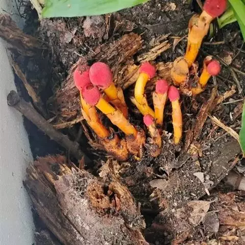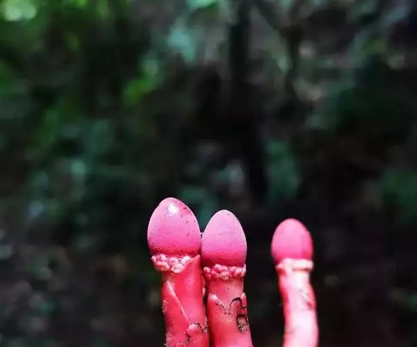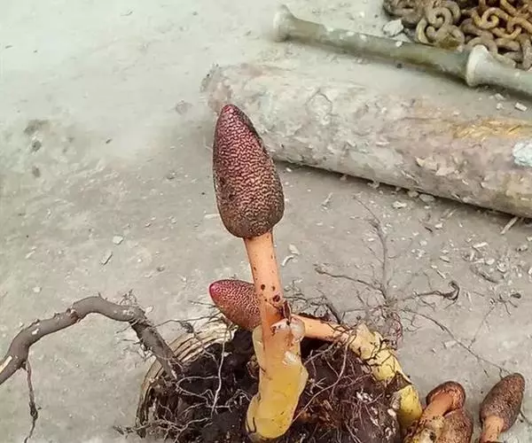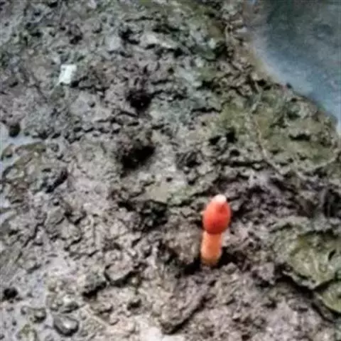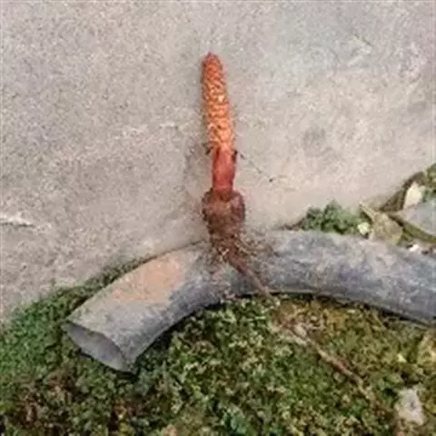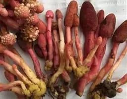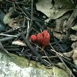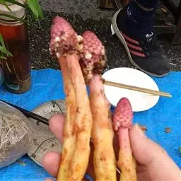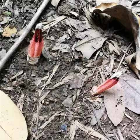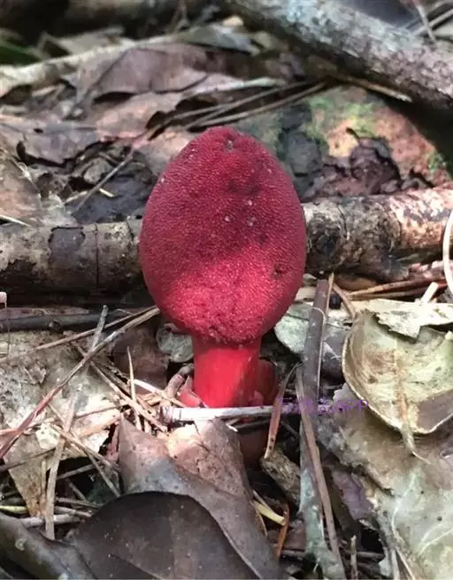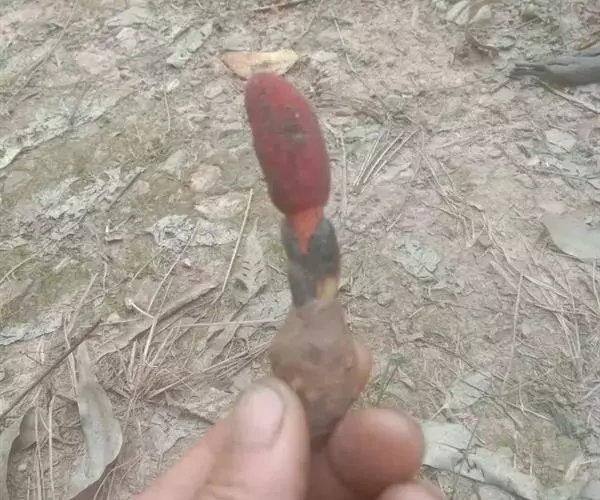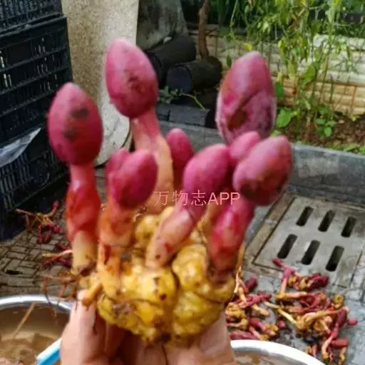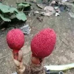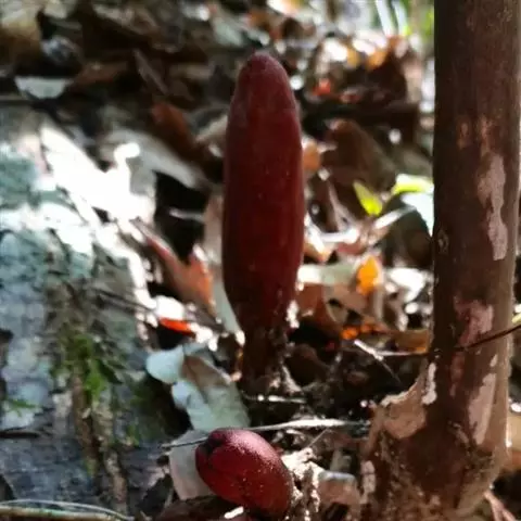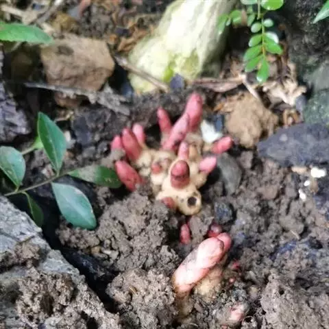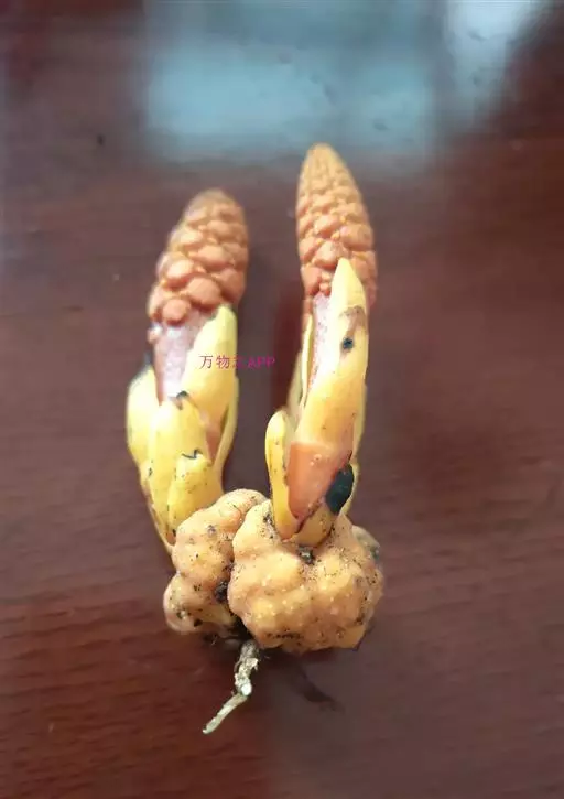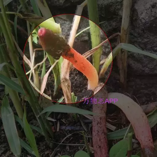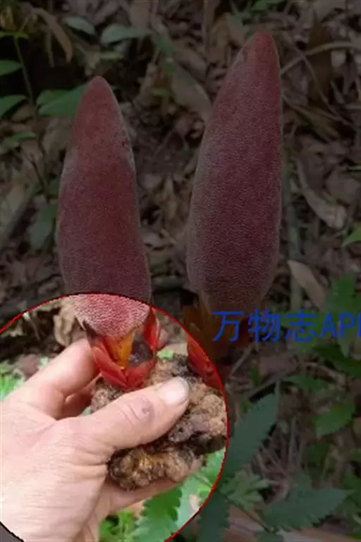 草本,高10-20厘米,全株鲜红色至暗红色,有时转紫红色;根茎分枝,分枝近球形,长1-3厘米,宽1-2.5厘米,表面密被粗糙小斑点和明显淡黄白色星芒状皮孔;花茎长5-10厘米;鳞苞片椭圆状长圆形,顶端钝,互生,8-14枚,长2-2.5厘米,宽1-1.5厘米,基部几全包着花茎。花雌雄异株(序);雄花序圆柱状,长3-18厘米,宽0.5-2厘米,顶端渐尖;雄花近辐射对称,疏生于雄花序上,花被裂片通常5(有时4或6),近圆形,长2-3毫米,顶端尖或稍钝圆;聚药雄蕊近圆盘状,有时向两侧稍延展,中部呈脐状突起,直径4.5-6毫米,花药5枚,小药室10;无梗或近无梗;雌花序卵圆形至长圆状椭圆形,向顶端渐尖,长2-6厘米,宽0.8-2厘米;子房卵圆形,宽约0.5毫米,具细长的花柱和具短子房柄,聚生于附属体的基部附近;附属体棍棒状或倒圆锥尖状,顶端截平或顶端中部稍隆起,中部以下骤狭呈针尖状,长约1毫米。花期9-11月。