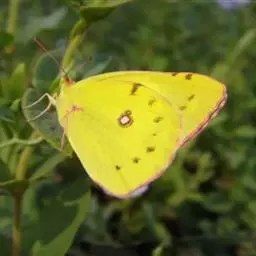 纹黄蝶,翅面黄色,缘毛桃红色;前翅外缘宽的黑边中有几个黄色斑,中室端部有一个黑斑;后翅外缘的黑色斑…