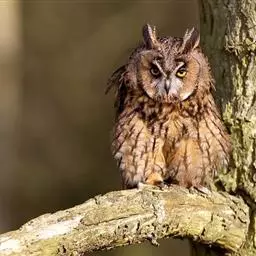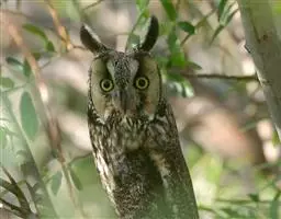 长耳鸮(学名:Asio otus),耳羽簇长,位于头顶两侧,竖直如耳。面盘显著,棕黄色,皱翎完整,白色而缀有黑褐色。上体棕黄色,而密杂以粗著的黑褐色羽干纹;颏白色,其余下体棕白色而具粗著的黑褐色羽干纹。腹以下羽干纹两侧具树枝状的横枝。跗蹠和趾密被棕黄色羽,眼橙红色。以小鼠、鸟、鱼、蛙和昆虫为食。对于控制鼠害有积极作用,应大力保护。属于中国国家二级保护动物。