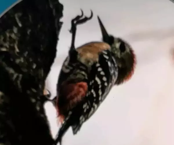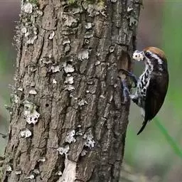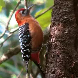 棕腹啄木鸟(学名:Dendrocopos hyperythrus)是中等体型的鸟类,体长约20厘米。头顶部具红色斑带。脚强健,有趾4个,其中2个向前,2个向后,各趾的趾端均具有锐利的爪,巧于攀登树木。尾羽的羽干刚硬如棘,能以其尖端撑在树干上,助脚支持体重并攀木。嘴强直如凿。舌细长,能伸缩自如,先端并列生短钩。攀木觅食时以嘴叩树。头骨十分坚固,大脑周围有一层绵状骨骼,内含液体,对外力能起缓冲和消震作用;能把喙尖和头部始终保持在一条直线上。錾树洞营巢,吃食昆虫,对防治林木害虫起到重要的作用,被称为“森林医生”