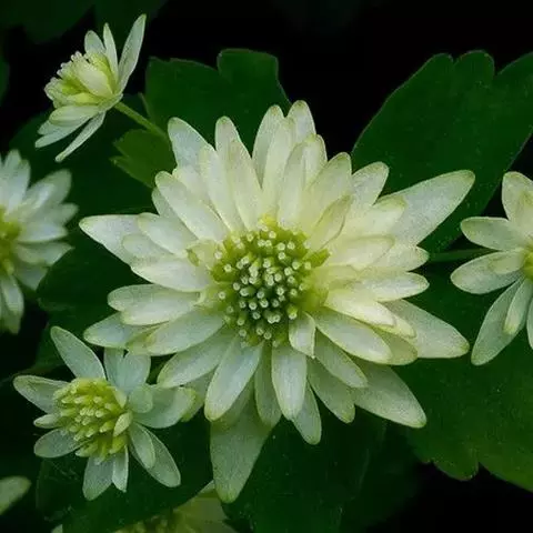 复单歧聚伞花序有稀疏分枝;花梗丝形,长0.3-2厘米;萼片白色,卵形,长约3毫米,早落;雄蕊长4-6毫米,花药椭圆形,长约0.6毫米,花丝上部倒披针形,比花药宽,下部丝形;心皮5-12(-16),有细子房柄,柱头近球形,无柄。瘦果近镰刀形,长约4.5毫米,有约8条细纵肋,柄长约1.5毫米。