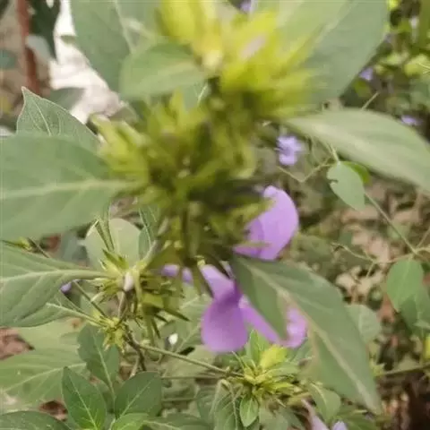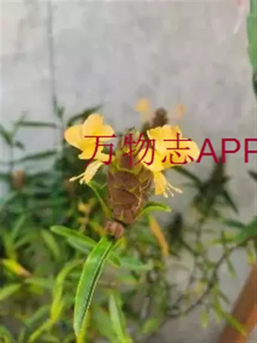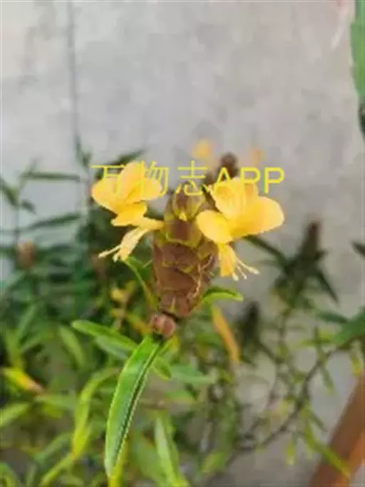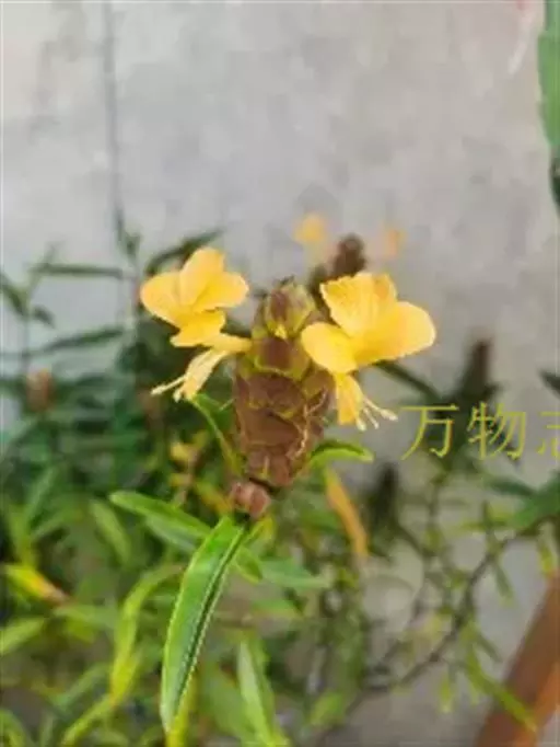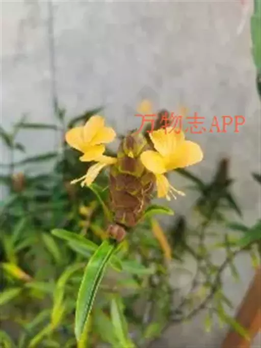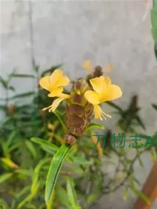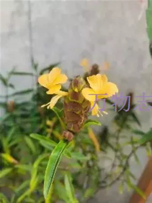 花密集着生于短枝上的苞腋,花序穗状;长枝及短枝基部的苞片为缩小的叶状,腋内着生1朵花,小苞片变成叉开的硬刺,向上逐渐变狭,苞片线状,长约10毫米,不再成刺;在正常叶腋着生的花的小苞片也变为叉开的硬刺,花果脱落后仍宿存;大花萼裂片卵形,先端渐尖,具软骨质尖刺,长14毫米,内面的略短,长13毫米,小萼狭卵形,长13毫米,先端渐尖;花冠黄色,长约2.4厘米,花冠管略短于喉部,下唇中裂片略宽而短,长8毫米,宽7毫米,两侧裂片与上唇裂近相等,长10毫米,宽6毫米;大雄蕊花药长3.2毫米,花丝长11毫米,小雄蕊花药长约1毫米,花丝长1.5毫米,均着生于喉基部;子房卵形,花柱线状,柱头略膨大,稍2裂,外露。蒴果卵形,长18毫米,径2.5毫米,先端渐尖成一实心的喙,内有种子2。