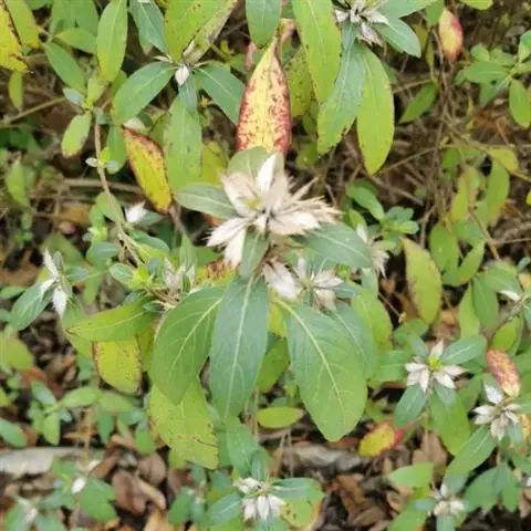 小灌木,高达1.2米,有分枝。枝条圆柱形,光滑,有皮孔,无毛。叶片纸质,椭圆形或有时卵形,两端急尖,基部下延,长枝叶叶柄长,叶片通常长5厘米,宽2.6厘米,最大可长8.5厘米,宽5厘米,短枝叶叶柄长10-15毫米,叶片长1.2-2.5厘米,宽1-1.5厘米,幼时两面被柔毛,后很快脱落,仅主脉上有稀疏糙伏毛,边缘有稀疏贴伏糙伏毛。