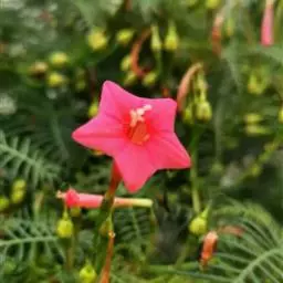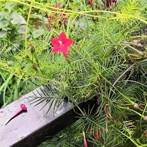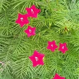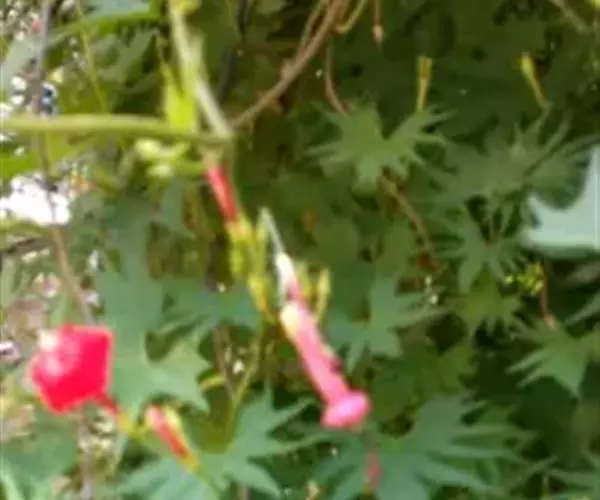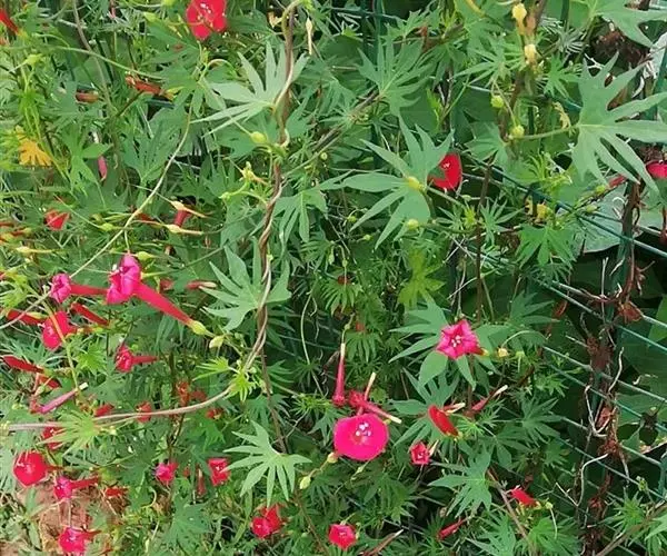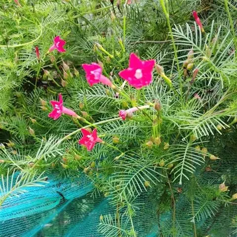 葵叶茑萝,为一年生缠绕草本。单叶互生,羽状深裂,裂片线形,细长如丝。聚伞花序腋生,着花数朵,花从叶腋下生出,花梗长约寸余,上着数朵五角星状小花,花高脚碟状,鲜红色或白色,花冠五浅裂,花冠边平展,花瓣五裂,整个花形远看似五角星,花冠红色,有白色及粉红色变种。