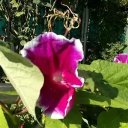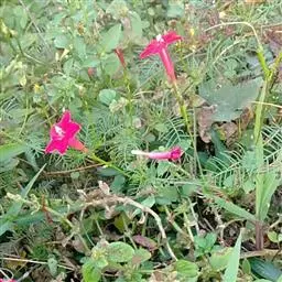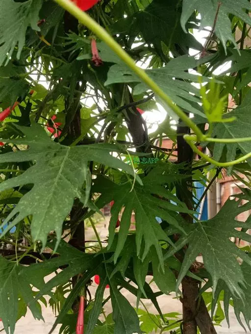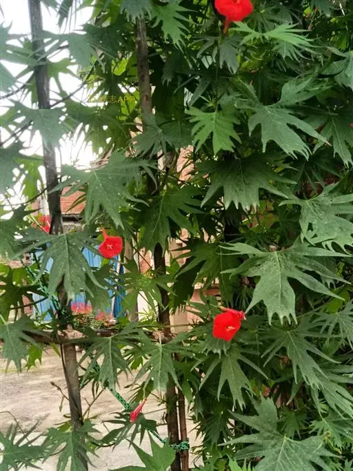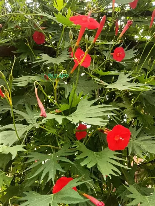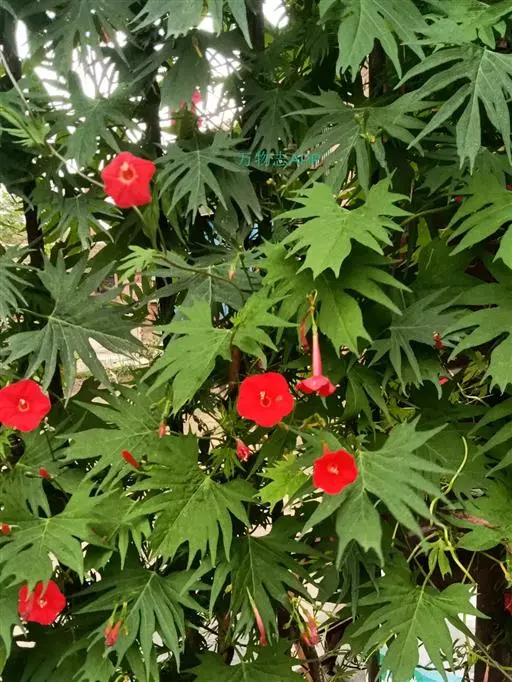 葵叶茑萝为旋花科的一种一年生蔓生草本。茎细长达数尺,其茎卷绕他物。叶掌状深裂端尖。夏月叶腋抽花轴,缀以数花,花冠长筒形,合瓣浅裂,色赤亦有白,雄蕊五枚,雌蕊一枚 ,秋后结子色黑。蒴果卵圆形,果熟期不一致。种子黑色,长卵形,有棕色细毛。花期7月至10月。茑萝的细长光滑的蔓生茎,长可达4-5米,柔软,极富攀援性,是理想的绿篱植物。它清晨开花,太阳落山后,花瓣便向里卷起,成苞状。它是一种细致可爱的植物,叶片纤细,似羽毛一样轻盈。每天开放一批,晨开午后即蔫。