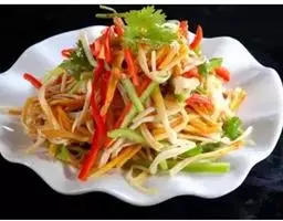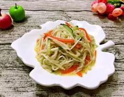 7、所有食材放入大碗中,加苹果醋、盐、麻油、少许糖(很少量,不能尝出甜味)和少许鸡精拌匀,装盘时上面撒上白芝麻即可。
