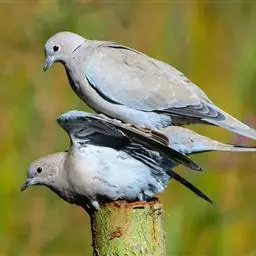 求偶的雄性在表演时身体会极度倾斜,并在绕圈飞行时舒展自己的双翅和尾巴以吸引雌性。 珠颈斑鸠通常为一夫一妻制,一年繁殖二到三次,繁殖期为4-11月份按地区划分(本人在上海观察斑鸠从四月份已经进入繁殖)。