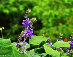 花序长5-20厘米或更长,总花梗密被或疏生小柔毛;花通常2-3朵生于每一节上;花梗长4-10毫米,被柔毛或近无毛苞片线状披针形,早落,被柔毛;花萼钟形,长3-4毫米,被柔毛或近无毛,4裂,裂片三角形,较萼筒短,长1-12毫米,上部裂片全缘或先端微2裂;花冠紫色或紫红色,长9-17毫米,旗瓣宽椭圆形或倒卵形,先端微凹,圆形,基部楔形,翼瓣、龙骨瓣均具瓣柄,冀瓣具耳;雄蕊长7-13毫米;雌蕊长9-15毫米,子房被贴伏短柔毛。荚果扁平,线形,长3-5厘米,宽4-5毫米,疏被贴伏短柔毛,腹缝线近直,背缝线圆齿状,有荚节4-6。