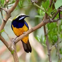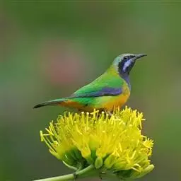 橙腹叶鹎体形大小和金额叶鹎相似,体长16~20厘米。额至后颈黄绿色,其余上体绿色,小覆羽亮钴蓝色,…