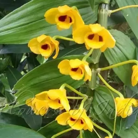 刀叶石斛(学名:Dendrobium terminale Par. et Rchb. f.):茎近木质,直立,有时上部分枝,扁三棱形,具多个节。叶二列,疏松套叠,厚革质或肉质,斜立,两侧压扁呈短剑状或匕首状;总状花序顶生或侧生;花序柄很短,常具1-3朵花,基部具数枚膜质鞘;花小,淡黄白色;花瓣狭长圆形,长3-4毫米,宽约1毫米,先端近钝,具1条脉;唇瓣贴生于蕊柱足末端,近匙形。花期9-11月。