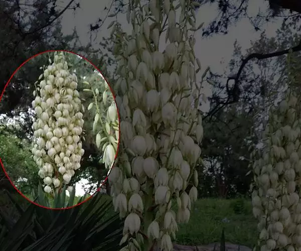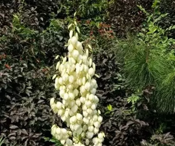 花莛高1米~2米,大型圆锥花序,有花多朵;花白色至乳黄色,顶端常带紫红色,下垂,钟形,花被 6片,卵状菱形;花期7月~9月。由于其巨大的花序十分引人注目,很受人们欢迎。是萨尔瓦多的国花。常在公园花坛中种植。在华北地区种植需稍加保护方能越冬。喜疏松、排水良好的砂质壤土和充足的阳光。生长势强健,栽培甚易。通常用分株和播种法繁殖。由于其叶片尖部为硬刺,易伤人,不宜家庭中种植 。
