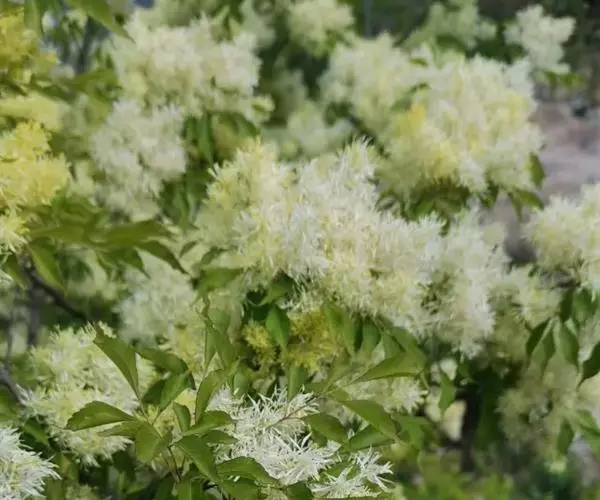 :圆锥花序顶生或腋生枝梢,长5-9厘米,疏被绒毛;花序梗扁平,长约1.5厘米,被细绒毛,渐秃净;花梗细,长约3毫米;雄花花萼小,杯状,萼齿尖三角形,花冠白色至淡黄色,裂片线形,长4-6毫米,雄蕊与裂片近等长,花药小,椭圆形,花丝细;两性花花萼较大,萼齿锥尖,花冠裂片长达8毫米,雄蕊明显短,雌蕊具短花柱,柱头2浅裂。