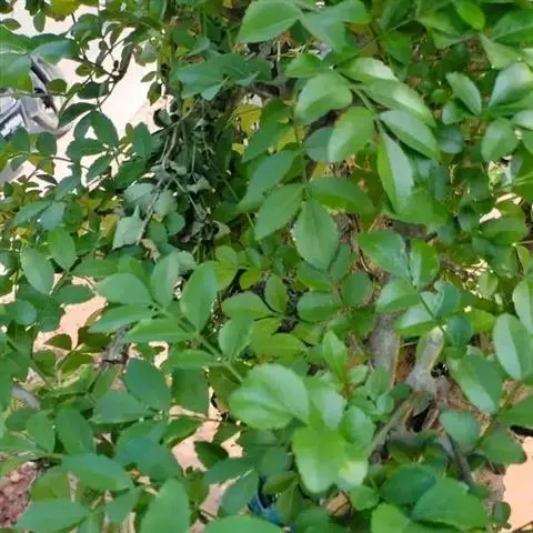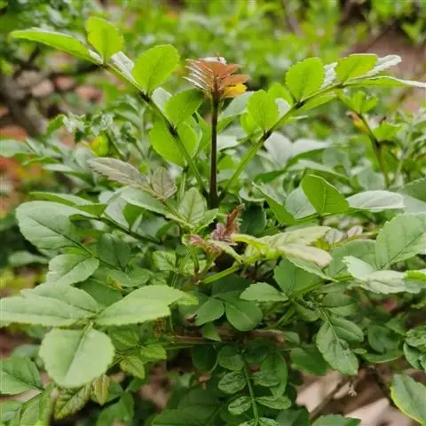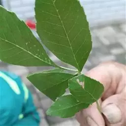 羽状复叶长5-15厘米;叶柄长2.5-4.5厘米,基部增厚;叶轴直,上面具窄沟,被细绒毛;小叶5-7枚,硬纸质,阔卵形,菱形至卵状披针形,长2-5厘米,宽1.5-3厘米,顶生小叶与侧生小叶几等大,先端尾尖,基部阔楔形,叶缘具深锯齿至缺裂状,两面均光滑无毛,中脉在两面凸起,侧脉4-6对,细脉明显网结;小叶柄短,长0.2-1.5厘米,被柔毛。