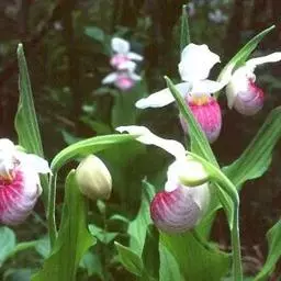 云南杓兰(学名:Cypripedium yunnanense Franch.):植株高20-37厘米,具粗短的根状茎。茎直立,无毛或在上部近节处疏被短柔毛,基部具数枚鞘,鞘上方具3-4枚叶。叶片椭圆形或椭圆状披针形。花序顶生,具1花;花略小,粉红色、淡紫红色或偶见灰白色,有深色的脉纹,退化雄蕊白色并在中央具1条紫条纹;花瓣披针形,长2.2-3.2厘米,宽7-8毫米,先端渐尖,稍扭转或不扭转,内表面基部具毛;唇瓣深囊状,椭圆形。花期5月。