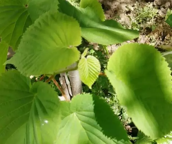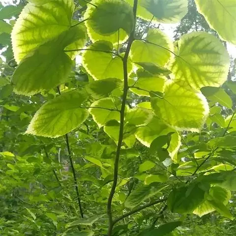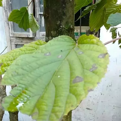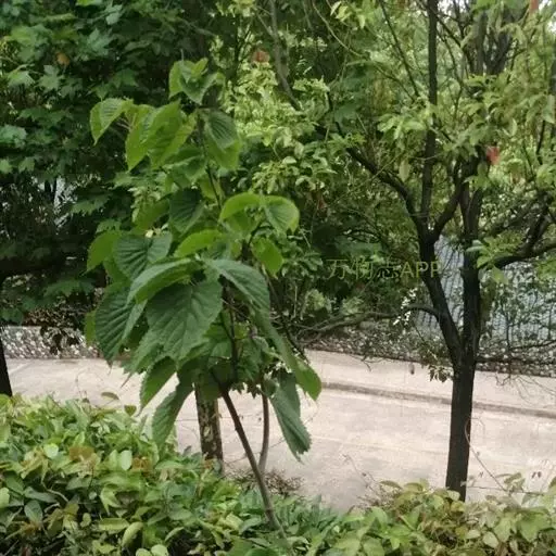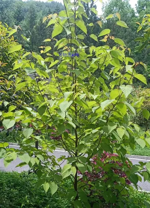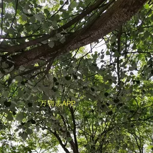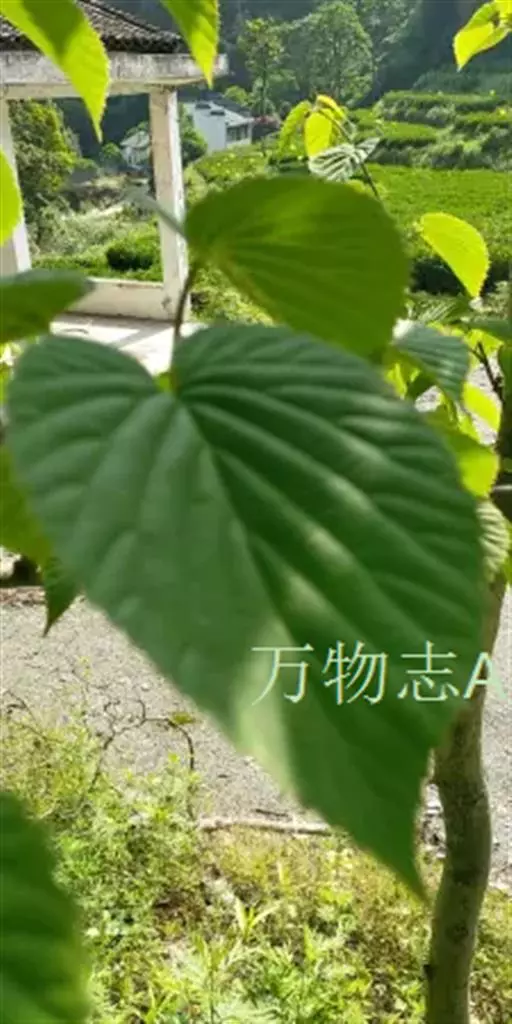 落叶乔木,高15-20米,稀达25米;胸高直径约1米;树皮深灰色或深褐色,常裂成不规则的薄片而脱落。幼枝圆柱形,当年生枝紫绿色,无毛,多年生枝深褐色或深灰色;冬芽锥形,具4-5对卵形鳞片,常成覆瓦状排列。叶纸质,互生,无托叶,常密集于幼枝顶端,阔卵形或近圆形,常长9-15厘米,宽7-12厘米,顶端急尖或短急尖,具微弯曲的尖头,基部心脏形或深心脏形,边缘有三角形而尖端锐尖的粗锯齿,上面亮绿色,初被很稀疏的长柔毛,渐老时无毛,下面密被淡黄色或淡白色丝状粗毛,中脉和8-9对侧脉均在上面显著,在下面凸起;叶柄圆柱形,长4-5厘米,稀达7厘米,幼时被稀疏的短柔毛。两性花与雄花同株,由多数的雄花与1个雌花或两性花成近球形的头状花序,直径约2厘米,着生于幼枝的顶端,两性花位于花序的顶端,雄花环绕于其周围,基部具纸质、矩圆状卵形或矩圆状倒卵形花瓣状的苞片2-3枚,长7-15厘米,稀达20厘米,宽3-5厘米,稀达10厘米,初淡绿色,继变为乳白色,后变为棕黄色而脱落。雄花无花萼及花瓣,有雄蕊1-7,长6-8毫米,花丝纤细,无毛,花药椭圆形,紫色;雌花或两性花具下位子房,6-10室,与花托合生,子房的顶端具退化的花被及短小的雄蕊,花柱粗壮,分成6-10枝,柱头向外平展,每室有1枚胚珠,常下垂。果实为长卵圆形核果,长3-4厘米,直径15-20毫米,紫绿色具黄色斑点,外果皮很薄,中果皮肉质,内果皮骨质具沟纹,种子3-5枚;果梗粗壮,圆柱形。花期4月,果期10月。