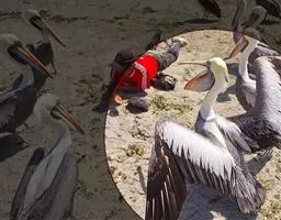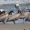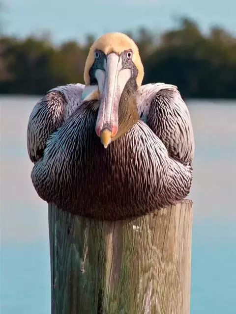 褐鹈鹕:是鹈鹕家族中体型最小的成员。体型粗大,体重6.5-9千克。嘴形宽大直长,上嘴尖端朝下弯曲,…