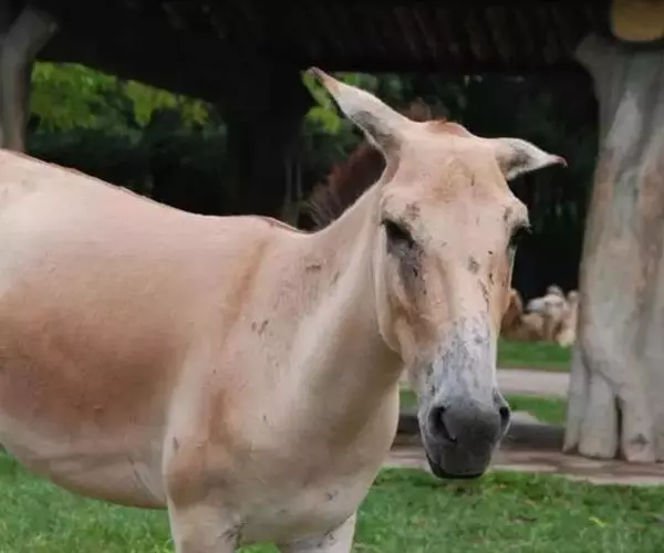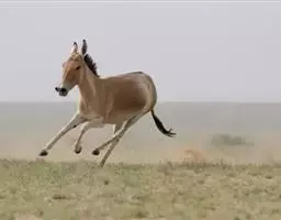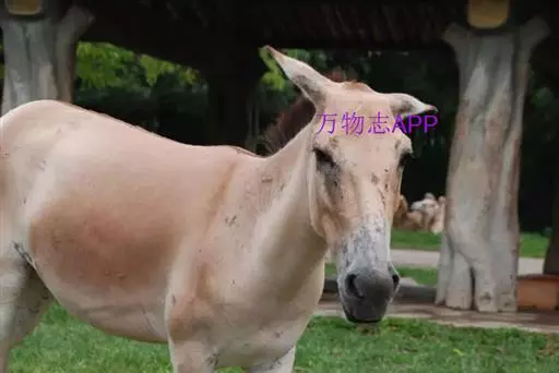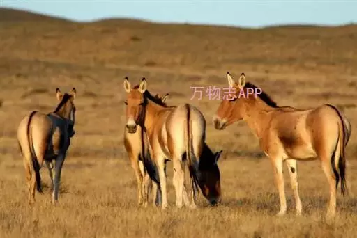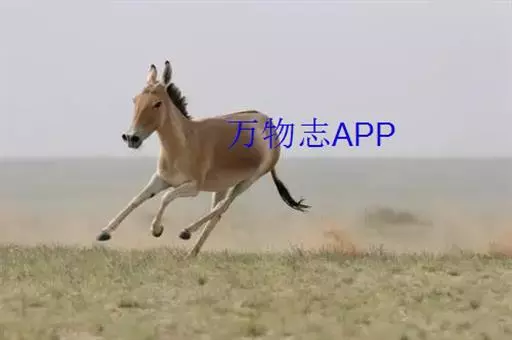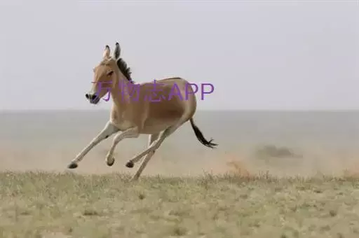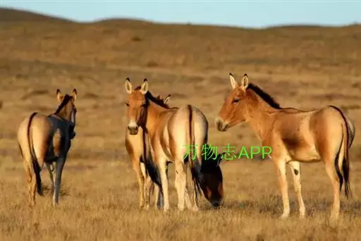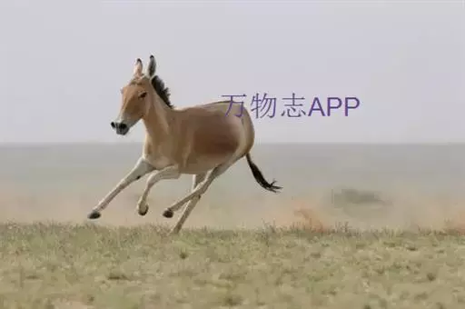 蒙古野驴(学名:Equus hemionus):外形似骡,体型介于家驴和家马之间,体长可达260厘米,肩高约120厘米,尾长80厘米左右,体重约250千克。吻部稍细长,耳长而尖。尾细长,尖端毛较长,棕黄色。颈背具短鬃,颈的背侧、肩部、背部为浅黄棕色,背中央有一条棕褐色的背线延伸到尾的基部,颈下、胸部、体侧、腹部黄白色,与背侧毛色无明显的分界线。