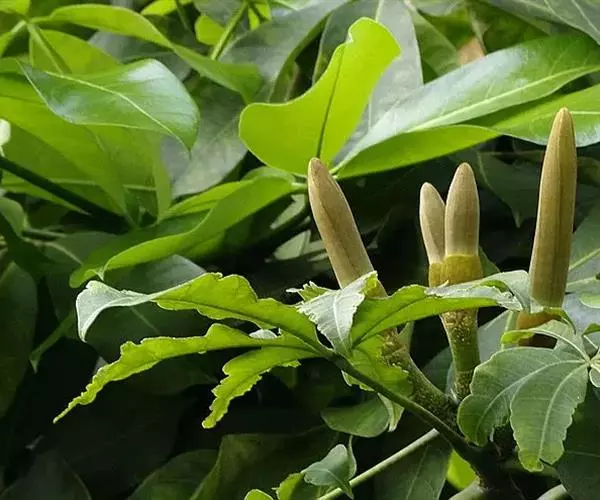 水瓜栗为掌状复叶,色彩墨绿,叶柄长10—25厘米,两端膨大成关节状;一片叶片中的小叶多为8枚,全缘,长l5—25厘米(—30厘米),先端宽为l0厘米左右,近基部渐狭,呈长倒卵形、倒卵状长椭圆形;小叶中部沿中脉下凹,状如小槽。叶的分布疏密度适中,采光和遮荫效果都好。